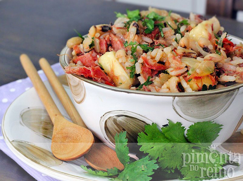 Receita de família cearense, que difere da sua por cozinhar o arroz, NO feijão previamente cozido, com os demais ingredientes.