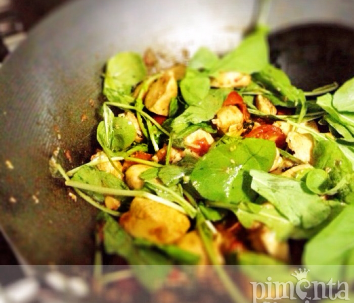 Numa wok vai óleo de gergelim e alho picadinho. Depois vem os cubos de frango, tempera com sal e pimenta, joga um tiquinho de saquê e deixa dourar. Junta o gergelim torrado, o tomate cereja cortado ao meio, mexe, espera uns 3 minutinhos. Junta o manjericão fresco e a rúcula, mistura e desliga.