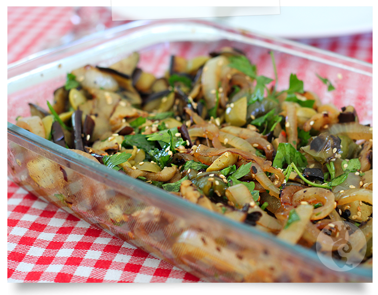 Agora é só fazer a salada – corte as berinjelas, tire o pimentão do plástico e retire a pele (que vai sair facilmente), corte-o em pedaços grandes e junte a cebola dourada. Tempere tudo com azeite, limão, sal e pimenta calabresa. Aqui eu ainda juntei azeitona verde, salsinha e gergelim torrado.